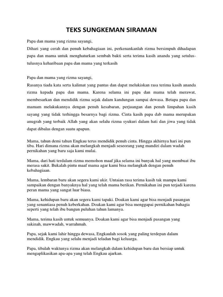 Dalam melakukan siraman ada tujuh orang yang akan menyiram air ke kepala mempelai. Menurut Alquran Surah Saba ayat 15 - 16. 5232017 Contoh Sungkeman Pernikahan - Sungkeman adalah sebuah tradisi menjadi ciri khas bagi masyarakat Jawa dimana acara sungkeman biasanya diadakan untuk melengkapi acara tertentu misalnya acara pernikahan.